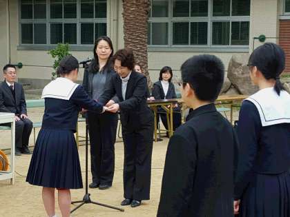 今日は、第69期生の入会式。校長先生から同窓会長の代理で、本校の歴史や同窓会の意義などの話があり、担当の先生からは、今年度の同窓会委員の紹介がありました。代表生徒からは、モニュメントの由来や二十歳の自分を夢見た作文についての説明がありました。5年後の再会を誓って『二十歳への夢』の扉を開き作文格納。最後は入会の立会人であるPTA役員・実行委員代表の方から、記念品の目録贈呈をしていただきました。