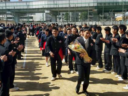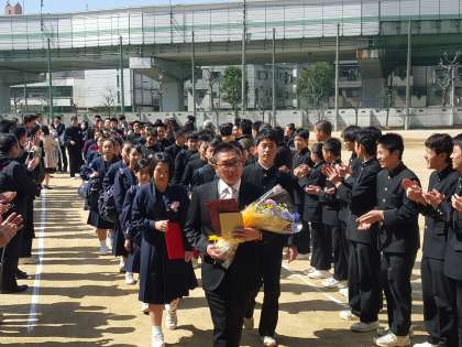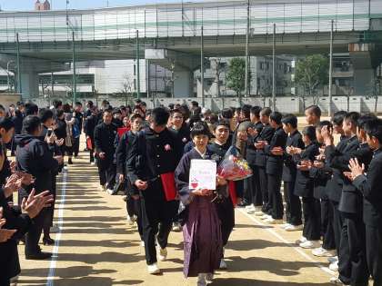 3月11日(金)、閉式後、在校生が奏でる澄み切ったリコーダーの音色で送られていく卒業生の姿は、堂々とした姿でした。教室に一旦戻り、最後のホームルーム。その後、地域・ご来賓、保護者、在校生、教職員が「花道」をつくりました。吹奏楽部の演奏と大きな拍手の中、担任の先生が先導して、69期生が誇らしげな表情で正門から巣立っていきました。
