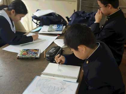 美術部は、それぞれの生徒が、お気に入りのアニメやゲームキャラクターを選び、鉛筆でスケッチ。彩りを添え、仕あげにかかる生徒もいました。女子ハンドボール部は、学校での半日練習。走力や筋力アップで、ボールの展開力やシュート力がさらについてきました。ソフトボール部は、運動場で気合の入った練習。ミートを意識した打撃練習など、基本に忠実なプレーを確認しながら行ってました。明日は試合に出るようです。