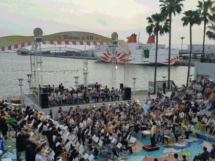 5月5日(木)午後、吹奏楽部は、大阪南港ATCの海辺のステージにおいて、大阪市音楽団(Osaka Shion)が主催する『Go!Go!コンサート』に参加しました。この演奏会は、大阪市音楽団が大阪城音楽堂で、5月5日に開催していた「Go!Go!市音」という催しを継承されたものです。