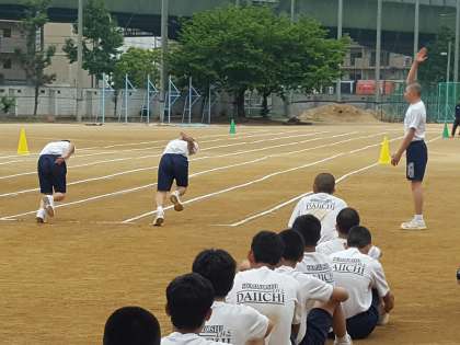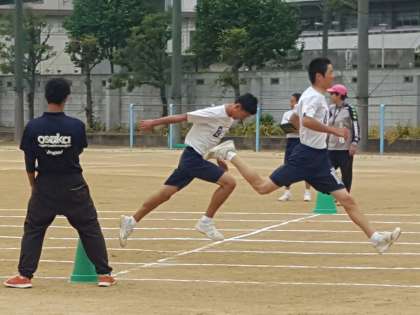 元気よく声を出しての準備運動の後、まずは、スタートで瞬発力を引き出す練習、腕の振りや足の振りあげを意識した練習、前傾姿勢からピッチをあげての走法練習などで、イメージをつかんでいるようでした。いよいよ2人ずつでの計測開始。最後まで懸命の走りを見せていました。さすがは、体力が増した3年生。フォームや走力に一段と力強さを感じました。