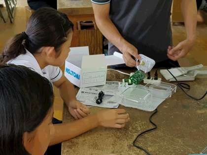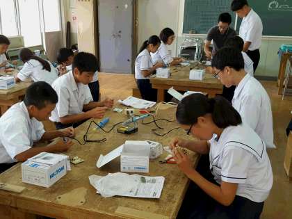 今日は「はんだ付けの学習」。リード線の根っこの部位に、はんだごてのこて先を当て、はんだを適量押し込んでいきました。作業は細心の注意を払って進め、最後はニッパで余分なリード線を切断して仕あげました。