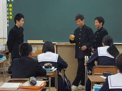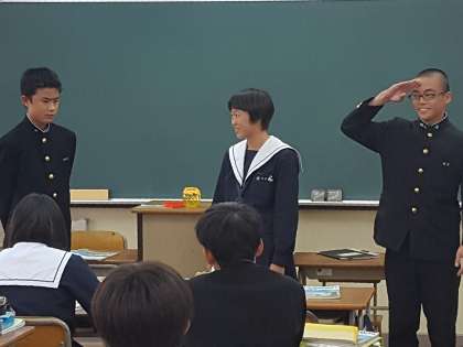 10月27日(木)3限、2年1組英語の授業は、グループごとに教科書にある「A Pot of Poison」を暗唱しての Presentation でした。生徒たちは、和尚さんやそれぞれの小僧に扮する役柄を演じ、ユーモラスな掛け合いを見事にこなすグループや、途中で詰まってしまったり、アクションの大きさに笑いをこらえながら、見入ってしまうグループもありました。