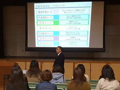 11月7日(月)午後2時30分より、3年生保護者対象の「進路説明会」を開催しました。今回の説明会は、大阪学芸高等学校・大阪府立今宮工科高等学校・大阪府立阪南高等学校の3校にお越しいただきました。各校からは、それぞれの学校の特色ある教育内容について説明いただきました。