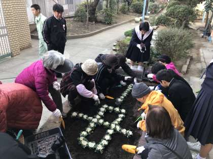 12月19日(月)午後、週明けは、寒さが幾分和らいだかのようです。本校では、生徒会と粉浜地域老人クラブ連合会とが一緒になって、葉ボタンを植える作業が、年の瀬の恒例行事となっています。今年も、生徒会役員・執行委員の数を上回る方々に、地域からご参加をいただきました。