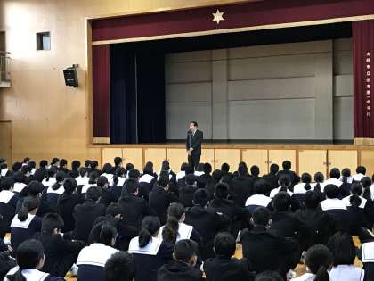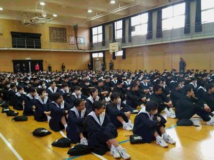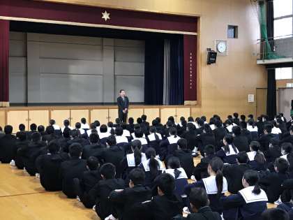 12月22日(木)、2学期の『終業式』が体育館で行われました。校長先生からは、2学期を振り返って、生徒会活動や部活動、学校行事で力を合わせてきた成果や、生徒の皆さんが日頃の学習面や生活面で、ずいぶん成長したとの話がありました。さらに近い将来、小中高校で学ぶべき教科内容が、どのように改訂されていくのかということにも言及されました。