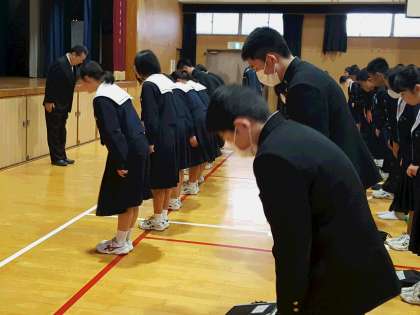 さて、今日は全学年で行う最後の全校朝礼。3年生は、明日から卒業式練習、9日(木)は公立高校一般選抜入試。生徒の皆さんにとって、3月は別れと新たな「出会い」の節目です。さらに、人との出会いで学びを深めていくのは「気づき」。ものの見方考え方は千差万別。新しい仲間と「主体的・対話的深い学び」をすることで、学び合い・高め合いが生じます。今後も、「出会い」「気づき」を大切にして、立派に成長してください。