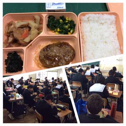 今年度から復活した選択制の給食。、今まで通り申し込んだ給食を食べるのも可能ですし、持参したお弁当を食べてもよいという風になりました。また、一年生は、初めての中学校での昼食時間。様子は写真の通りです。