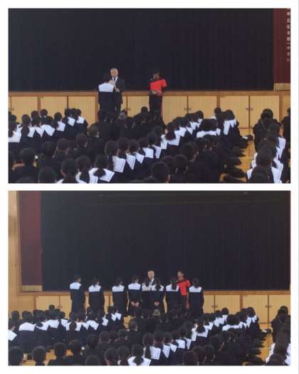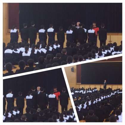 2日(火)、体育館で全校集会がありました。最初に、剣道部、ソフトテニス部の皆さんが、7ブロックで優勝したので、その賞状伝達がありました(写真ー上)。そして、各学級の役員が決まりましたので、代表して3年1組のそれぞれの役員に認証状を受け取ってもらいました。その後、校長先生から「新学期が始まり一か月が過ぎましたが、みんなにとって居心地のいい学級ができていますか。一部の人だけが居心地がいいとかではなく、学級の皆がホッとできる場所になっていますか。今、認証状を渡した人は選ばれた人たちで、その責任を果たしてくれると期待しています。また、代表の人たちが活動しやすいように協力をするのが選んだ人の責任と思っています。それぞれの立場で、選んだ責任、選ばれた責任を果たし、みんなが居心地良く過ごせる学校にしてください。」というお話がありました。さらに、連休を有意義に過ごすようにというお話でした。