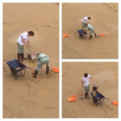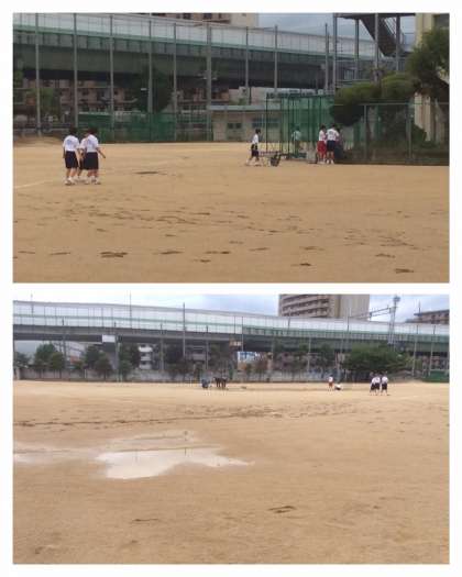 昨夜(9日(火))からの雨でグランドには、たくさんの水たまりができました。管理委作業員さんや体育委員などの人が中心になってグランド整備をしてくれました。