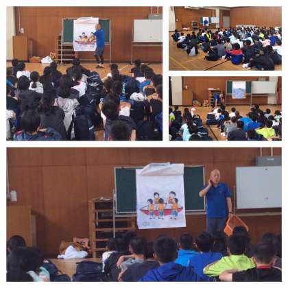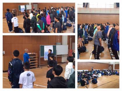 昼食後、これからの活動の準備をしてに集まりました。大きな声で校歌を歌った後、宿舎のスタッフの方に代表生徒が挨拶をしてくれました。そして、活動の説明を受けました。いよいよ、活動開始です。