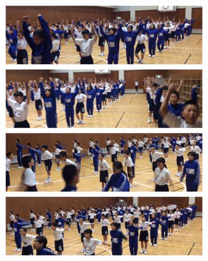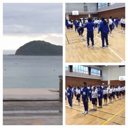 夜中、大雨でしたが、起床時刻の6:30ごろは雨の勢いは多少弱まりました。7:00、体育館で集合。ラジオ体操をして、目を覚ましました。