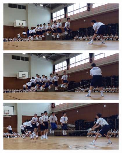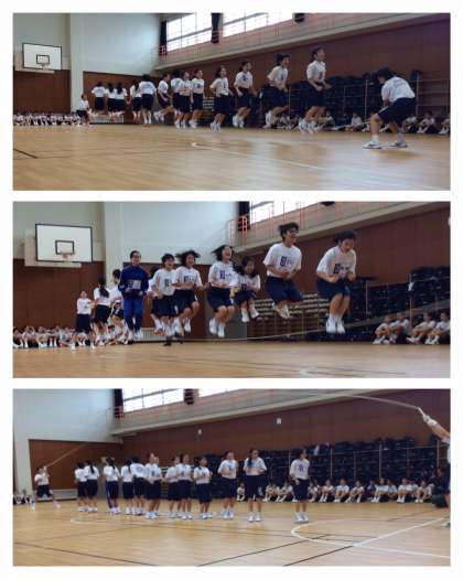各グループで練習の後 グループごとで大縄跳びをして、男女の跳んだ合計数で、勝敗を決めました。初めての大縄跳びでしたが、よく頑張ったと思います。