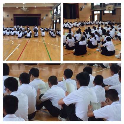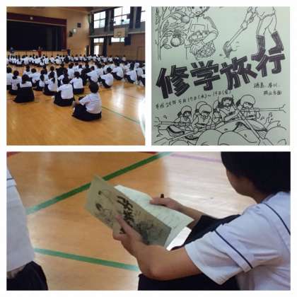 明日17日(水)から、2泊3日で、徳島・岡山地方に修学旅行に出発します。その前日指導が行われました。しおりを見ながら、先生の話を真剣に聞いていました。楽しい思い出を一杯にして無事に帰ってきてください。