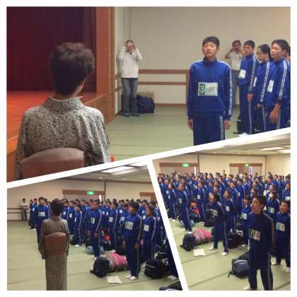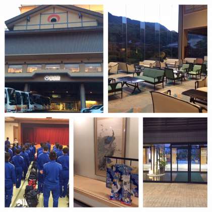 金比羅さんのふもとの琴平温泉にある琴参閣に到着。入館の挨拶の中で、みんなで校歌を歌いました。いつものように規律正しく、大きな声でしたので、宿舎のスタッフの方々も大変驚かれていました。
