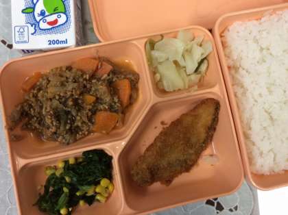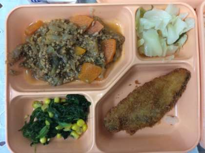 6月1日(木)の給食は、なすのミートソース煮、サーモンフライ、ほうれん草とコーンのソテー、キャベツときゅうりのドレッシングあえでした。