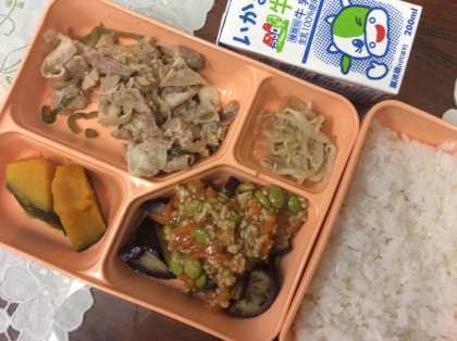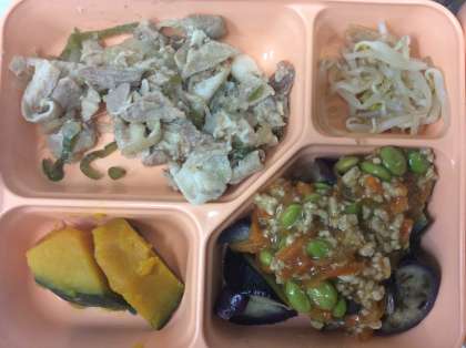 13日(火)のメニューは、豚肉の甘辛煮、焼きナスのそぼろあんかけ、かぼちゃの煮物、もやしのおひたしです。