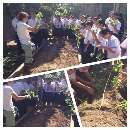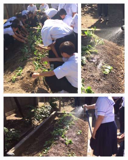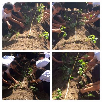 13日(火)、6限2年3組もサツマイモの苗を植えました。ツルを土にさしただけで、サツマイモができるのかな?疑問をもったまま、水やりなどのお世話をしてください。