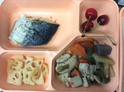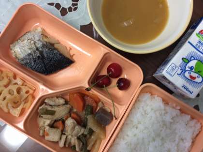 14日(水)の給食は、さごしの塩焼き、鶏肉と野菜の煮物、れんこんおきんぴら、さくらんぼ、みそ汁です。