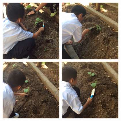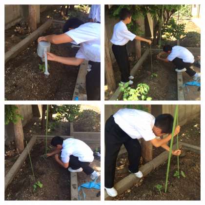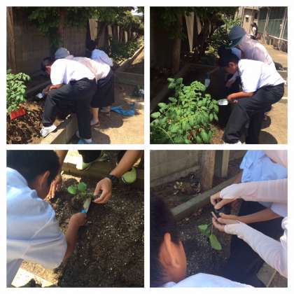 15日(木)、3限に、あすなろ学級では、トマトに続き、ナスときゅうりを植えました。あすなろの友だちは、トマトもキュウリも苦手ということですが、自分たちで作った野菜な別物では?