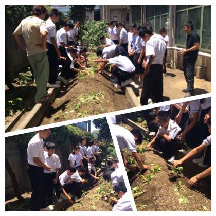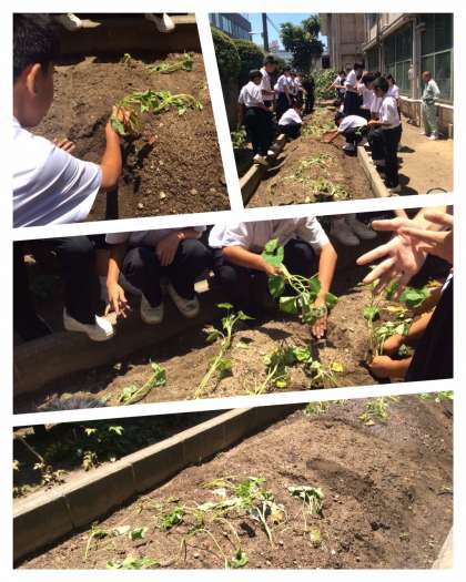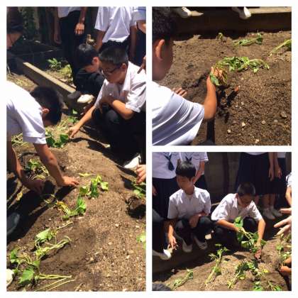 15日(木)4限、1組3組に続いて、2年2組が学習園でサツマイモの苗を植えました。おいしいさつまいもができるといいですね⁉
