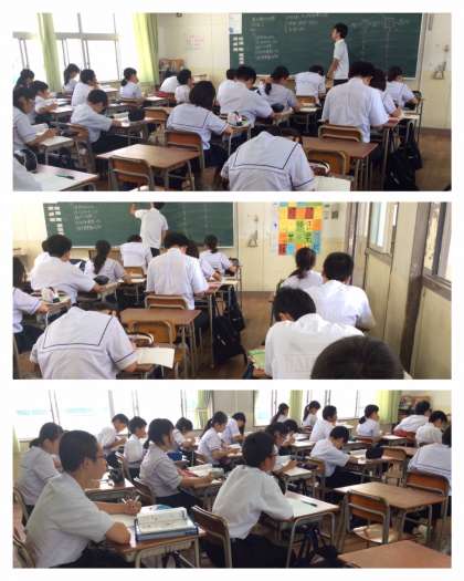 2年生の1限目の授業の様子です。突然撮影に行ったので、カメラが気になる人も中にいましたが、ほとんどの人が集中していました。1組は、英語(上段)。2組は、国語(中段)。3組は、数学(下段)でした。