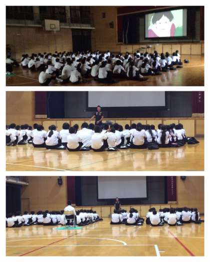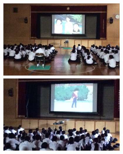 1年生は、26日(月)1限、体育館でDVD[新ちゃんが泣いた」というアニメを見ました。病気で、足に障がいを負った新ちゃんを取り巻く話で、障がいのある人への理解を中心に学習しました。鑑賞後、学年主任の森本先生から、「人にはできること、できないことがあるけれども、ともに支えあって学校生活を送っていってほしい。間違っても、できないことや劣っていることをバカにし、イジメが起きることがないようにしよう。」というお話がありました。