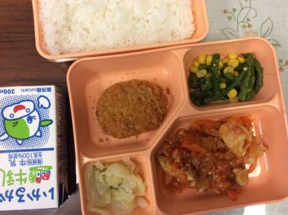 本日の献立は、鶏肉のトマトソース煮、コロッケ、グリーンアスパラガスとコーンのソテー、キャベツのドレッシングあえです。