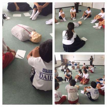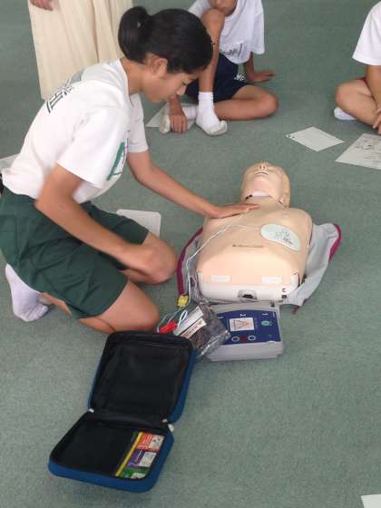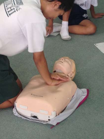 期末テストが終わり、避難訓練の後、救命救急講座が開かれ、保健委員や希望生徒が参加しました。DVDを見てから、実際に人形を使って、人工呼吸、心臓マッサージの実習を行いました。冷房が効いているとはいえ、暑い中、ご苦労さんでした。