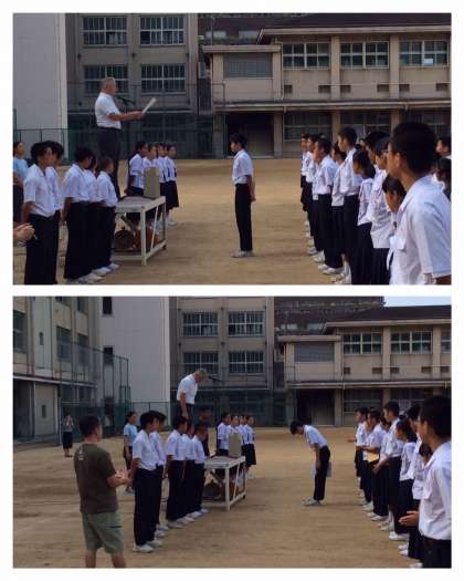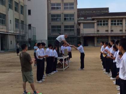 10日(月)、全校朝礼で、卓球部の3年生男子のシングルスの部の表彰を行いました。その後、校長先生から、文字だけの通信は、誤解を生じやすいことを理解したうえで、スマホなどの情報機器を使うか、電話や直接会って連絡をするなどの工夫をしましょうという話でした。