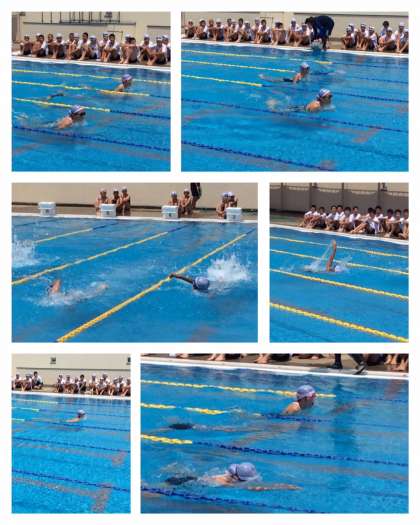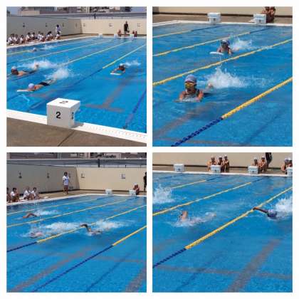 13日(木)は、1年生の水泳大会でした。朝からの猛暑でした。真夏の光が照りつける中で、水泳大会が始まりました。バタ足レース、クロール、平泳ぎ、背泳ぎ、碁石拾い。1年生は、浮き輪レースもありました。その後リレーが続きました。
