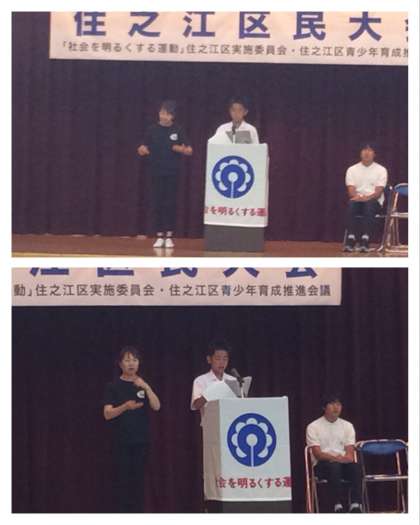 林君は社会を明るくする運動住之江区実施委員長の若山さんから表彰状を、住之江の西原区長さんから記念品の贈呈を受けました。そのあと、たくさんの参加者の前で作文「今、生きているということ」を読んでくれました。非常に落ち着いてわかりやすく読んでくれました。作文に触れ、あちらこちらで涙をぬぐう姿が見られました。