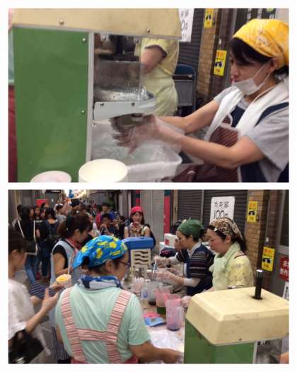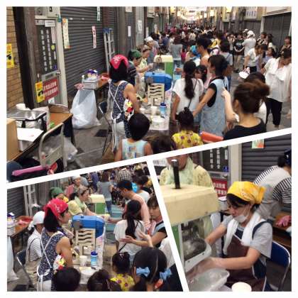 日中、36度を超す猛暑。夜といえども、熱気は残ったままの粉浜商店街で「ザ夜店」にて、PTA実行委員会のみなさんが、かき氷を提供してくれました。本校PTAは、19時30分からでしたが、常に長蛇の列で、大変忙しくされていました。商店街では、本校の生徒もよく見かけましたが、礼儀正しく、挨拶をしてくれました。