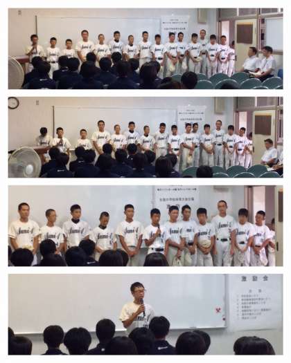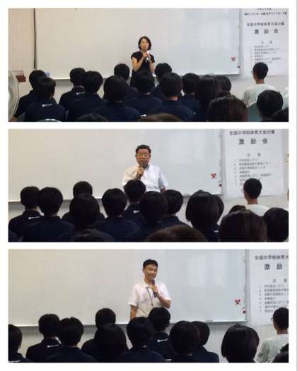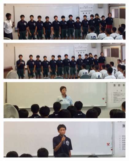 14日(月)16時から、粉浜連合振興町会の久保会長や住吉区役所の総務課長さんをはじめ、地域の方々、講演会、保護者、PTAの方々が多数参加のもと、激励会が開催されました。男子ソフトボール部と女子ハンドボール部が全国中学校大会九州ブロック大会に出場するため、多数の方々に参加していただきました。ソフトボール部は、鹿児島県で大会が行われます。女子ハンドボール部は、沖縄県でそれぞれ開催されます。来賓の方々からの激励の言葉の後、部員紹介と決意表明をしてくれました。ともに、悔いのない試合をして、良い結果を報告できるように頑張ってくると力強く両キャプテンからありました。がんばれ、一中生!