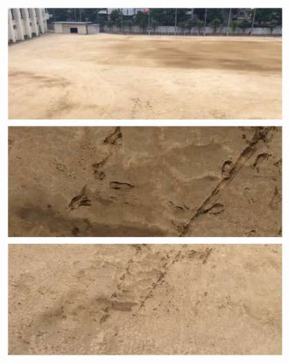 12日(火)の大雨により、本校グラウンドは、当日は池のようになっていました。写真は、14日(木)の昼ごろの様子ですが、二日経ったにもかかわらず、また部活動の生徒たちが水たまりの水をスポンジで吸って、使えるようにしているにもかかわらず、一部では写真のような状態です。