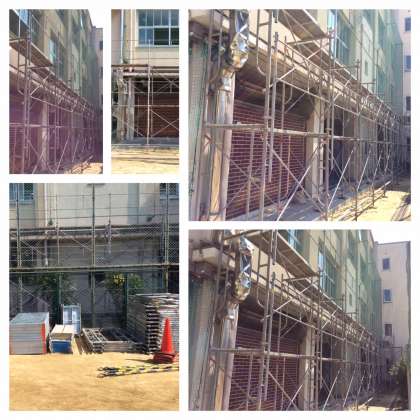 10日(火)より、南館の外壁工事が始まりました。初日は、作業用の足場の組み立てからです。工事現場には安全確保のため、近づかないようにしてください。