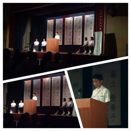 いよいよ、文化祭の舞台発表がはじまりました。開会のことばを文化祭委員会の副委員長から宣言。続いて、7月にあった社会を明るくする運動で優秀な作品として選ばれた1年生の林くんの発表がありました。作品内容については、校長室だより7月号に掲載。