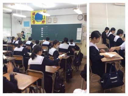 19日(木)は、3年生の10月実力テストです。国語、英語、数学、社会、理科の時間割です。来週は、中間テストが控えています。テストが集中していますが、頑張ってください。(写真上段は配布の様子です。)