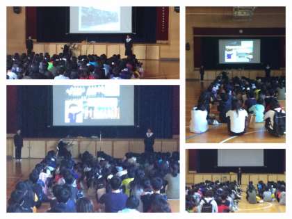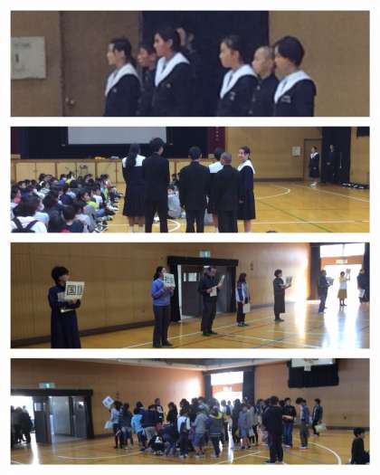 粉浜小学校、北粉浜小学校の6年生を中学校に迎えて、中学校の紹介と授業体験をしてもらいました。生徒会役員の生徒が中学校や自分たちの生活を紹介してくれました。