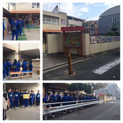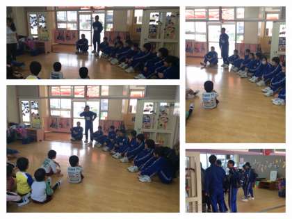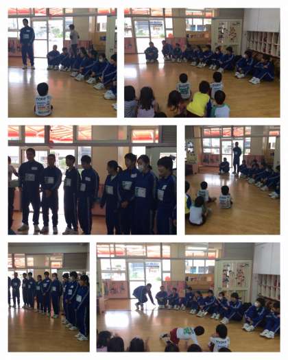 家庭科の授業の一環として、3年2組の生徒が、粉浜幼稚園に保育実習に行きました。園長先生にご挨拶をしました。そして、年長組、年中組に生徒たちは分かれました。年中組のグループは、まず自己紹介から始めました。