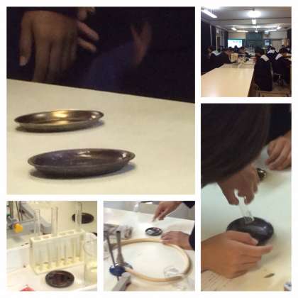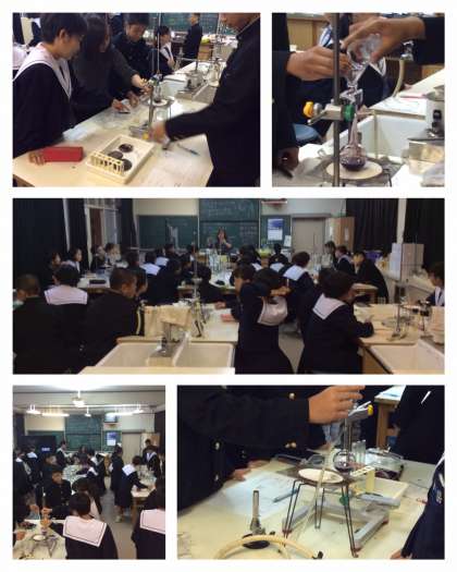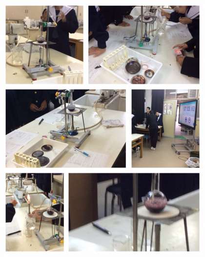 3組の理科の授業を参観しました。川尻先生が理科室で行いました。「身のまわりの物質」についての学習で、混合物である赤ワインを蒸発させて、集めた液体が何でできているのかを確認する実験でした。バーナーの使い方などを慎重に行いながら、集めた液体に火を近づけると燃えるという結果が出てきた班がありました。