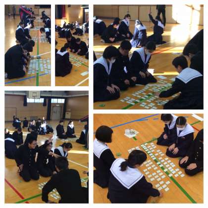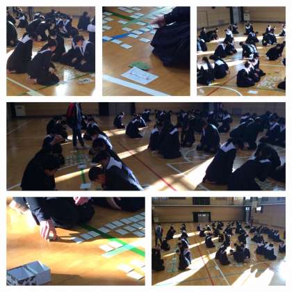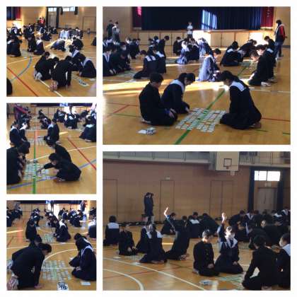 2年生は、体育館で、百人一首大会が行われました。班対抗で対戦をしました。読み手の先生から読まれると、上の句だけで、札に手が伸びる人がたくさん見受けられました。日頃の成果の賜物でしょうか?楽しいひと時を過ごすことができましたね。