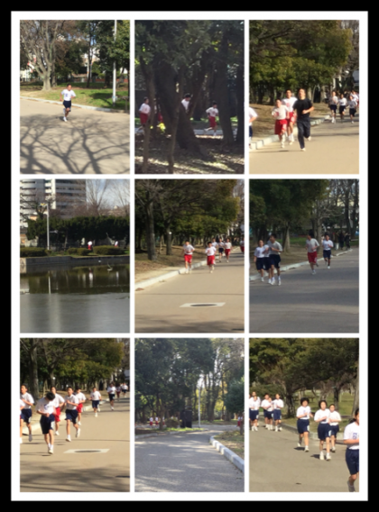 朝の冷え込みが厳しかったので、公園内の池も半分以上がまだ凍ったままでした。寒い中でしたが、一生懸命走り、気持ちのよい汗を流していました。同じコースを宮川先生も一緒に走ってくれました。