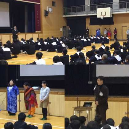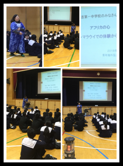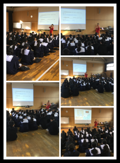 西原区長さんをはじめ、区役所、JOCAのご協力で、国際理解教育が行われました。全体の場で区長さんからご挨拶をいただいた後、学年別の会場に移動しました。3年生は、体育館で、津田さんのアフリカのマラウイでの活動を教えてもらいました。2年生は、格技室で西さんからスリランカ、バングラディシュの話を聞かせていただきました。1年生は、光畑さんからインドでの体験を聞きました。それぞれ、映像を使って、分かりやすく、楽しくお話していただきました。