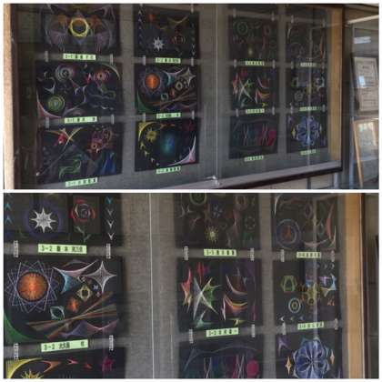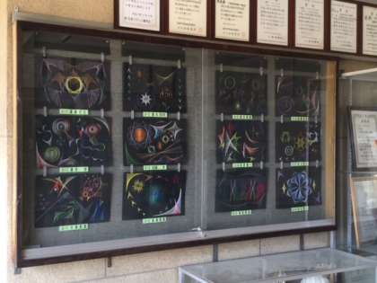 13日、玄関の掲示物が三年生の作品に替わっています。授業で作り上げた作品です。