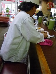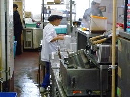 「餃子の王将 玉出店」では、衛生面に注意するため、ユニフォームと帽子を着せてもらい、スタッフの方々のお仕事を学習しました。