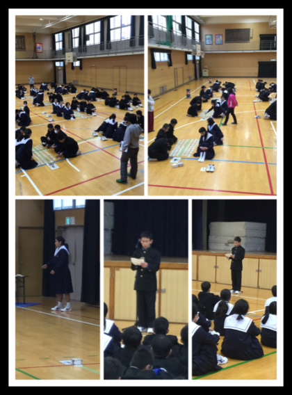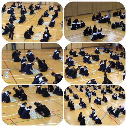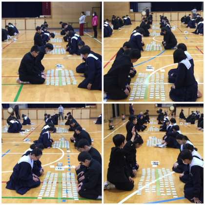 15日(木)、5.6限に1年生は、体育館で百人一首大会を行いました。各クラス二人一組のグループを作ります。1クラス18グループができます。3クラスのそのグループが集まり、対戦を行いました。対戦グループは、6人一組になります。体育館に18組の6人グループができました。上の句から読み上げると、あちらこちらから「ハイ」という元気な声が聞こえてきました。札をとった時の声です。このようにして、真剣な中にも、楽しい時間を過ごしました。