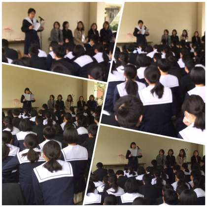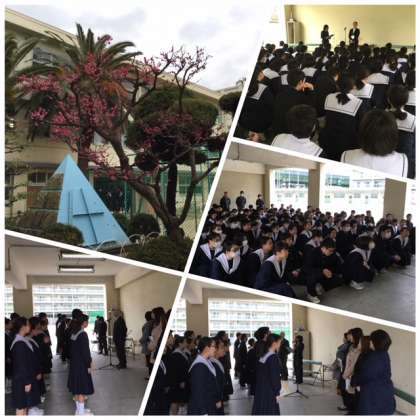 9日(金)、午前9時より、PTAの上村会長はじめ、役員、実行委員の皆さまのご出席のもと、同窓会入会式、モニュメント格納式、PTA記念品贈呈式を行いました。運動場が昨夜来の雨で、ピロティ−に3年生が集合して式典を行いました。校長先生のあいさつの後、71期生の同窓会委員の紹介、同窓会から記念品の贈呈がありました。