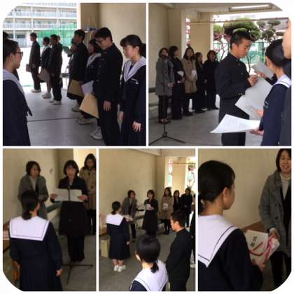 続いて、「20歳の私」という作文をモニュメントに格納します。作文をクラスごとに入れた封筒を記念の瓶に入れました。また、PTAから卒業にあたり、卒業証書のファイルや時計などの贈呈式も併せて行いました。5年後の4月29日に、同窓会総会で、モニュメントから作文を入れた瓶を取り出します。お楽しみに!