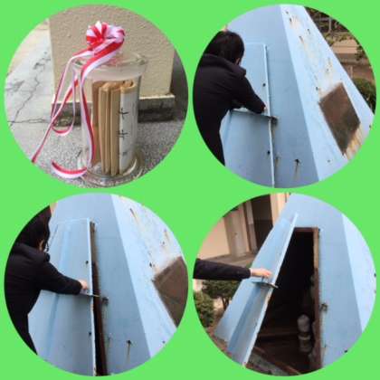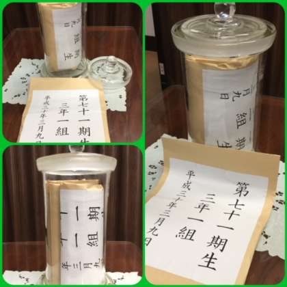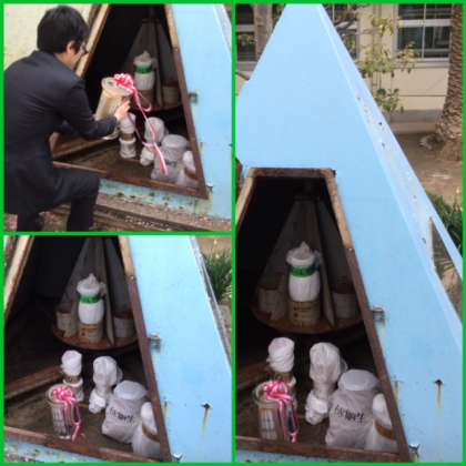 本来は、瓶を生徒たちで、モニュメントに格納するのですが、非常に足元が悪かったため、学年の先生がモニュメントに入れてくれました。